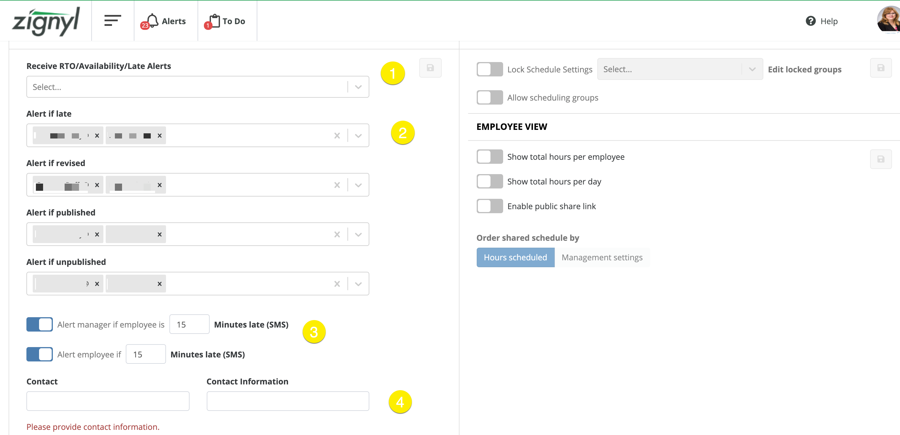 Select the individual(s) to alert if schedule is late, which manager when schedule is revised, published or if it is unpublished.