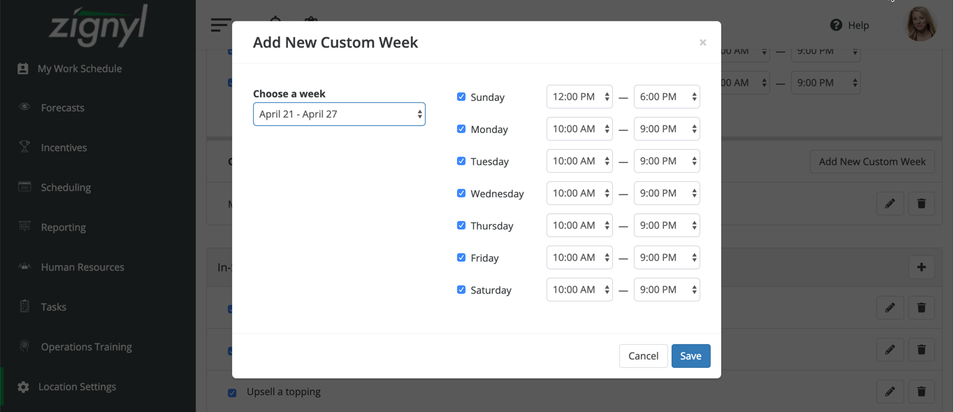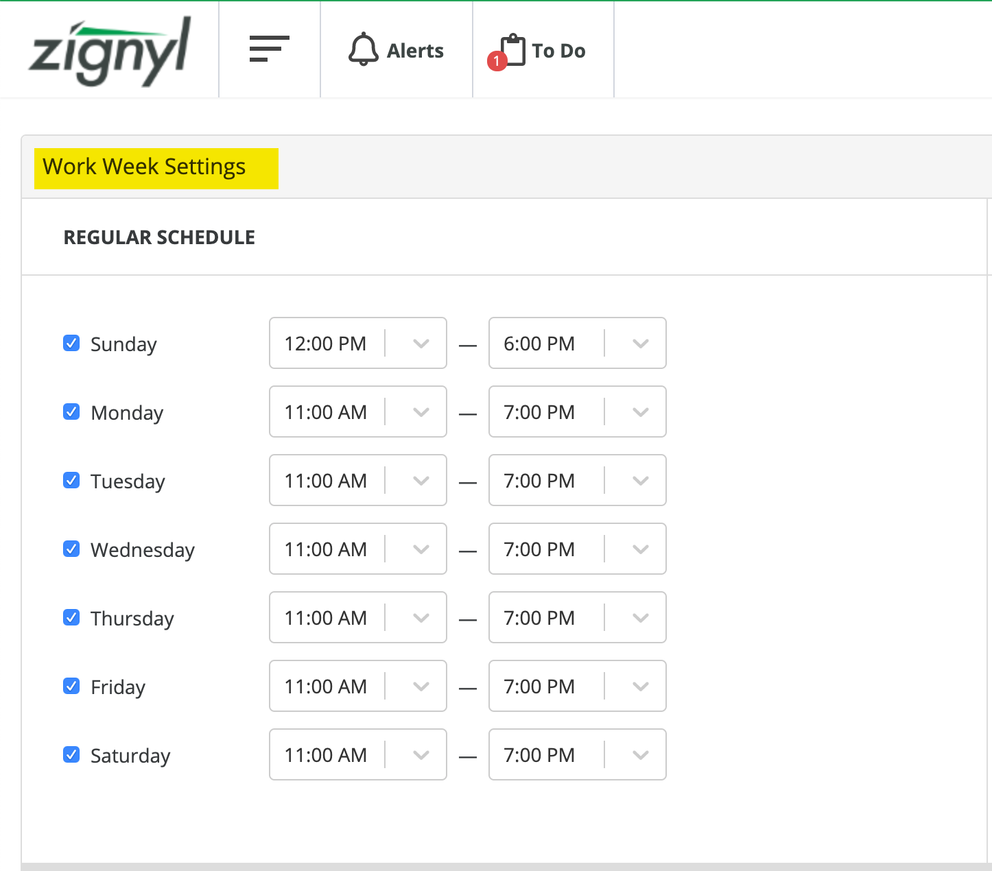 Result: The Zignyl Clipboard will use these temporary hours for that week only, then revert to the regular schedule.