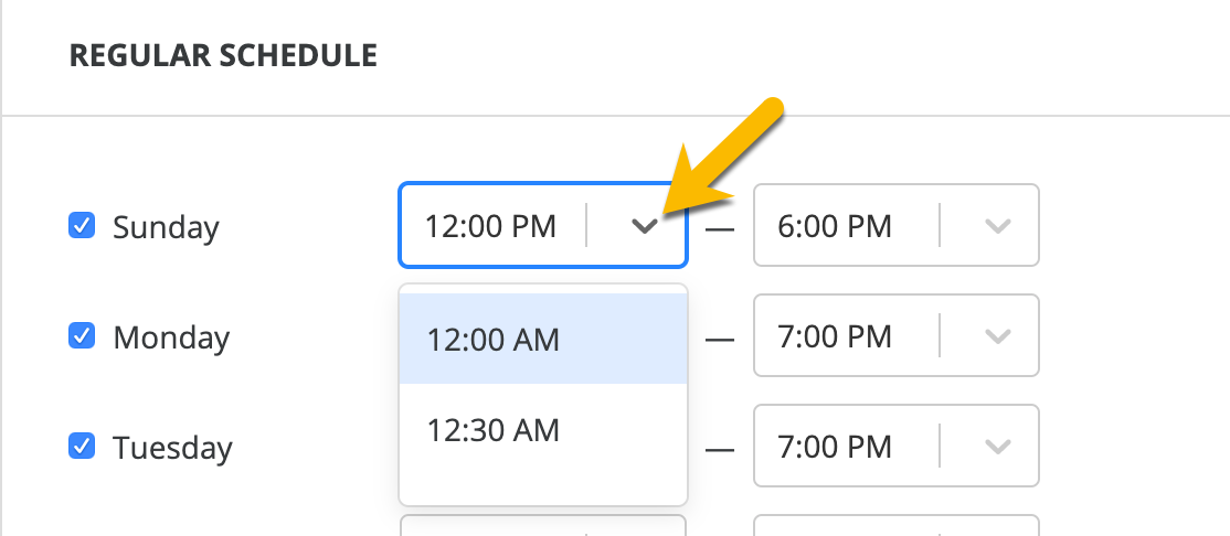 Regular Schedule: Click the dropdowns for each day to set the standard Open and Close times.