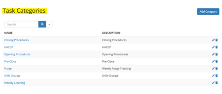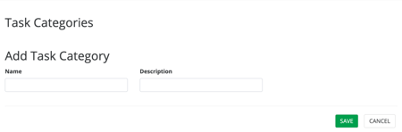 Click on the Add Category button. This will take you to the Add Task Category screen. Here you can provide a name and description for the category. You can also edit or delete task categories by clicking on the pencil or trash icons.