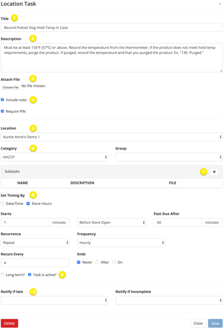 Include Note, Require PIN. Clicking these boxes are necessary for tasks that require notes, such as temperatures, as well as the PIN identification of the person that completes the task.