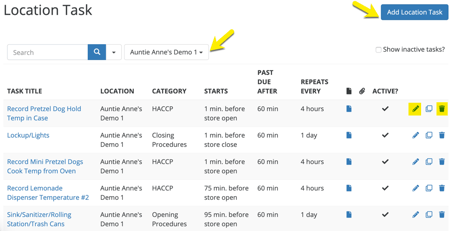 Here you will see the Location Tasks. Choose the location that you want to see the tasks for from the drop down. You can add by clicking on the Add Location Task button. Also you are able to edit or delete existing tasks by clicking on the pencil or trash icons. Remember that managers do not have access to task creation/editing, and must work with their Area Director or Company Admin. For more on roles and permissions, see this article.