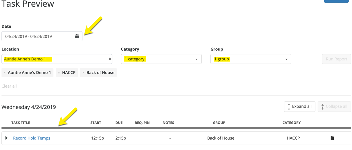 The Task Preview Report displays every task, in time order, that appears over a given time period. This report is designed to make it easy to rearrange and edit tasks. This report allows for you to see what order tasks appear in, how long each task has to be completed, and the descriptions and attachments that are connected to each task.
